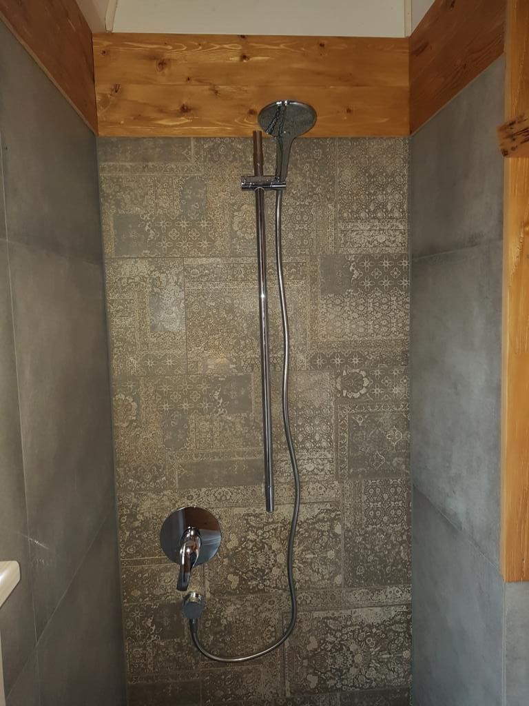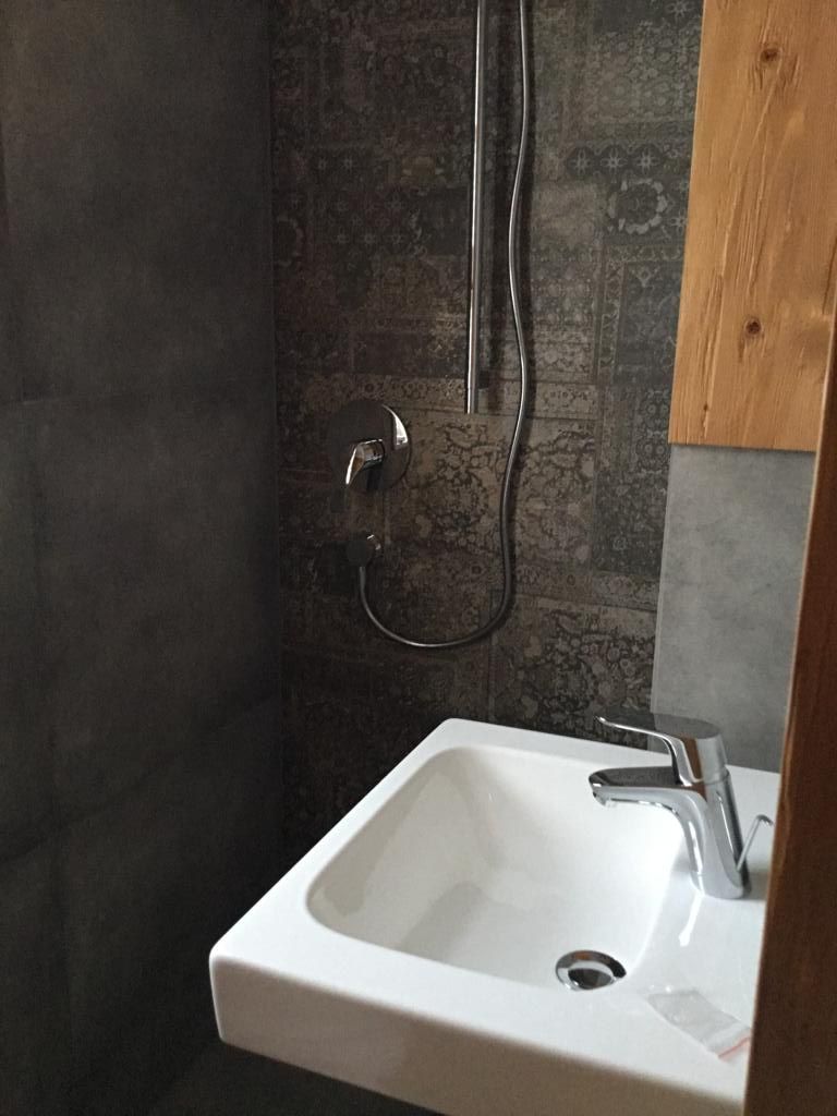 - Badezimmer mit Dusche mit Ablaufrinne (Betonestrich), Waschtisch und Trenntoilette